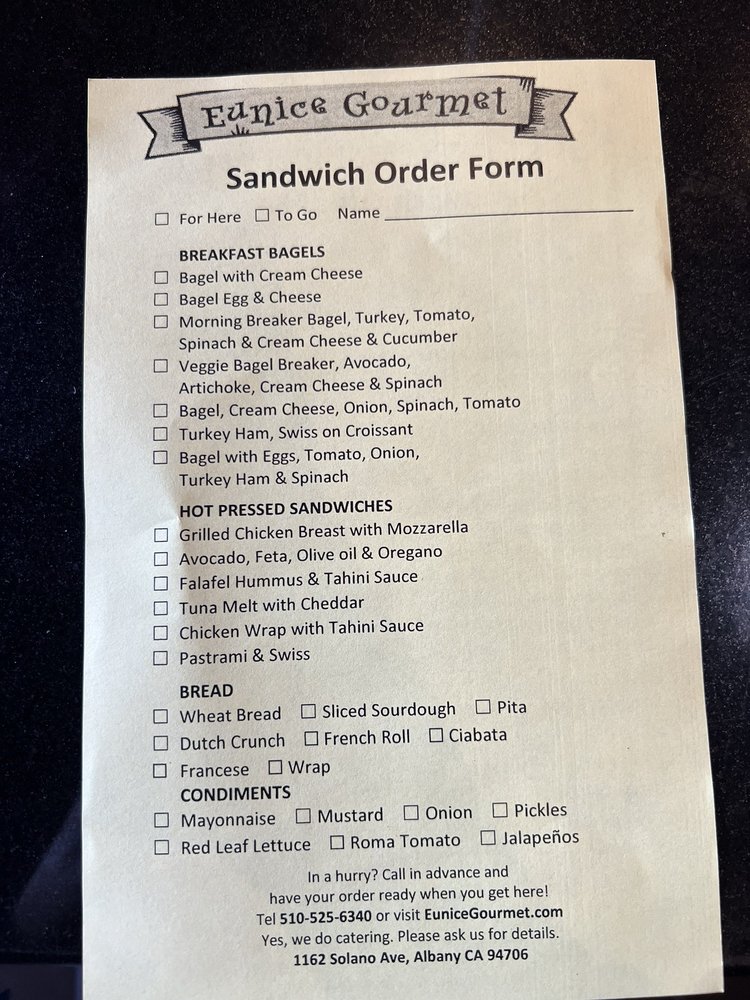 Welcome to Eunice Gourmet Cafe, a delightful gem nestled at 1162 Solano Ave in Albany, CA. This charming cafe specializes in creating mouth-watering sandwiches, making it the perfect stop for breakfast or lunch any day of the week.